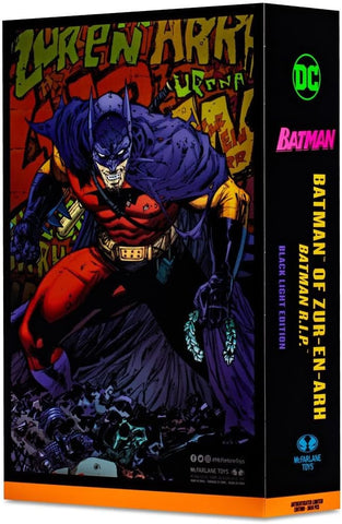 Based on Grant Morrison's intriguing Batman R.I.P. story arc, Batman dons a purple cowl with a brazen red-and-yellow Batsuit. Brash Bruce Wayne makes criminals cower with exclusive black-light deco! The Batman of Zur-En-Arh comes with a baseball bat, a knife, an exclusive card stand, and a detailed display base with two battery-powered black lights. Also included is a collectible art card with a Batman illustration on the front and a certificate of authenticity on the back. Fully articulated, the curiously colorful crime-fighter stands approximately 7-inches tall and comes in deluxe packaging. This DC Multiverse Batman of Zur-En-Arh Black Light Gold Label 7-Inch Scale Action Figure - Exclusive is limited to 3,010 pieces, so order now! Ages 12 and up.