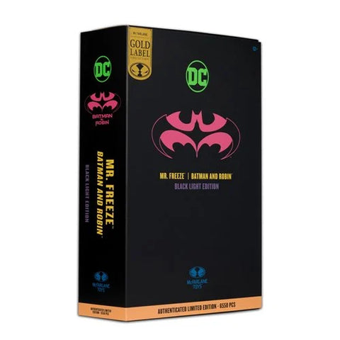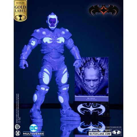 Mr. Freeze is featured in chilling black light glow deco. This incredibly detailed 7-inch scale action figure is based on the iconic Batman & Robin movie. Mr. Freeze is designed with up to 22 moving parts for full range of posing and play. He comes with a freeze ray with ice effect, an exclusive card stand, and a detailed black light base with two battery-powered black lights. Also included is a collectible art card with character art on the front and a certificate of authenticity on the back. Add the limited-edition DC Multiverse Batman and Robin Mr. Freeze Black Light Gold Label 7-Inch Scale Action Figure - Exclusive to your collection! Ages 12 and up.
