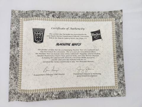 Description:  Brand new and unused!  Would be sealed, if they came that way in the first place (BotCon sets are often sold without a 'seal' of any sort)  Includes all accessories and paperwork, even the BotCon 2013 pin and certificate